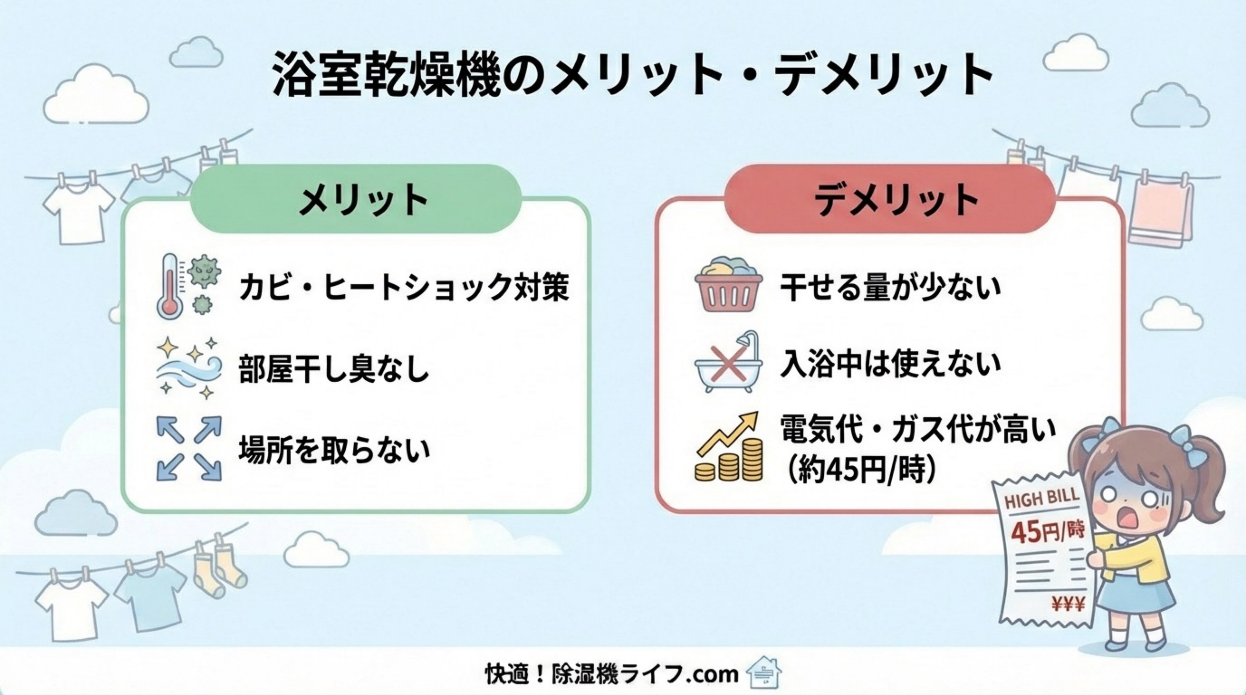 浴室乾燥機で洗濯物を乾燥するデメリットについて詳しく説明します。