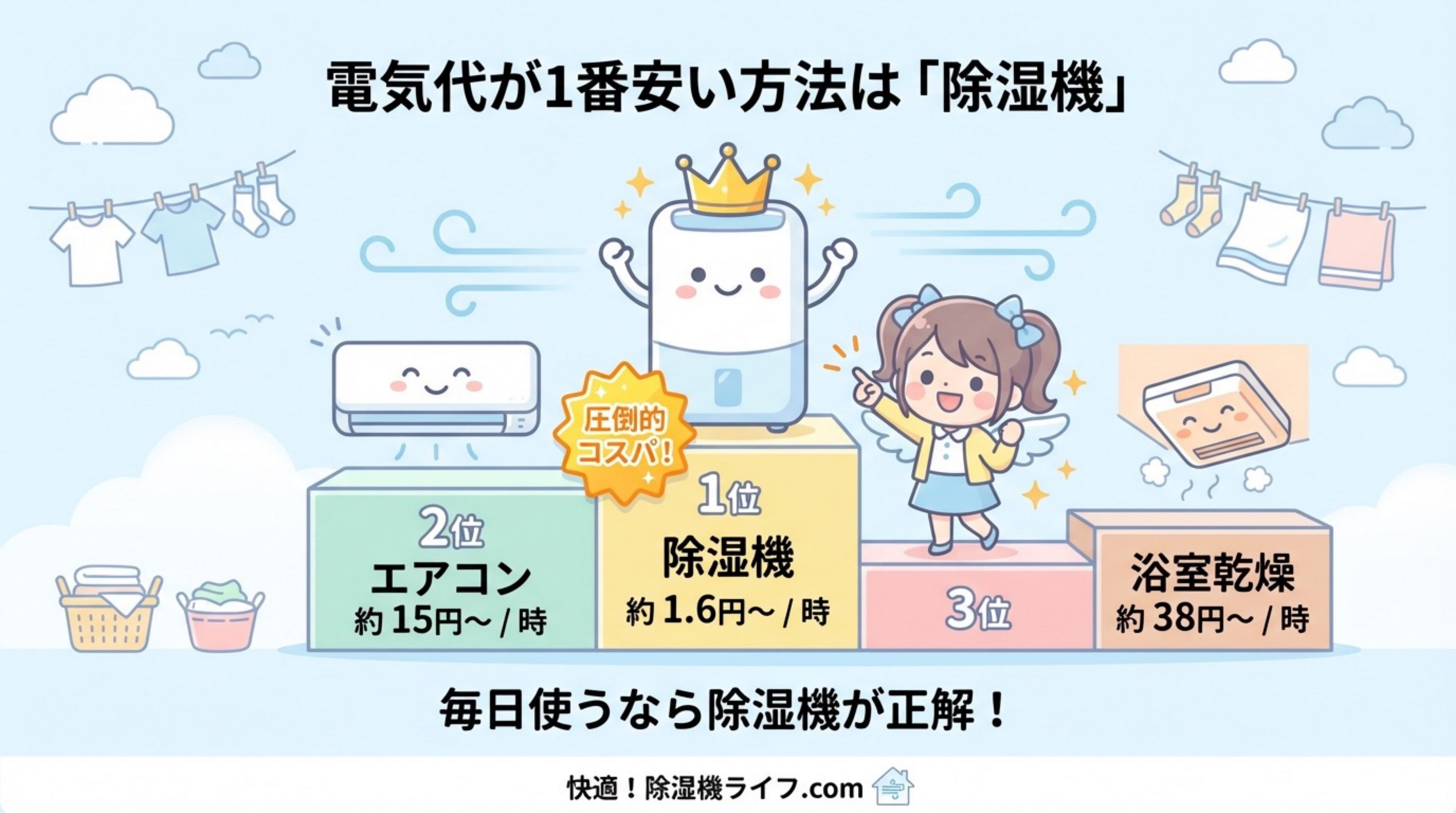 まとめ【電気代を比較】除湿機VSエアコン乾燥VS浴室乾燥で1番安く洗濯物を乾かす方法