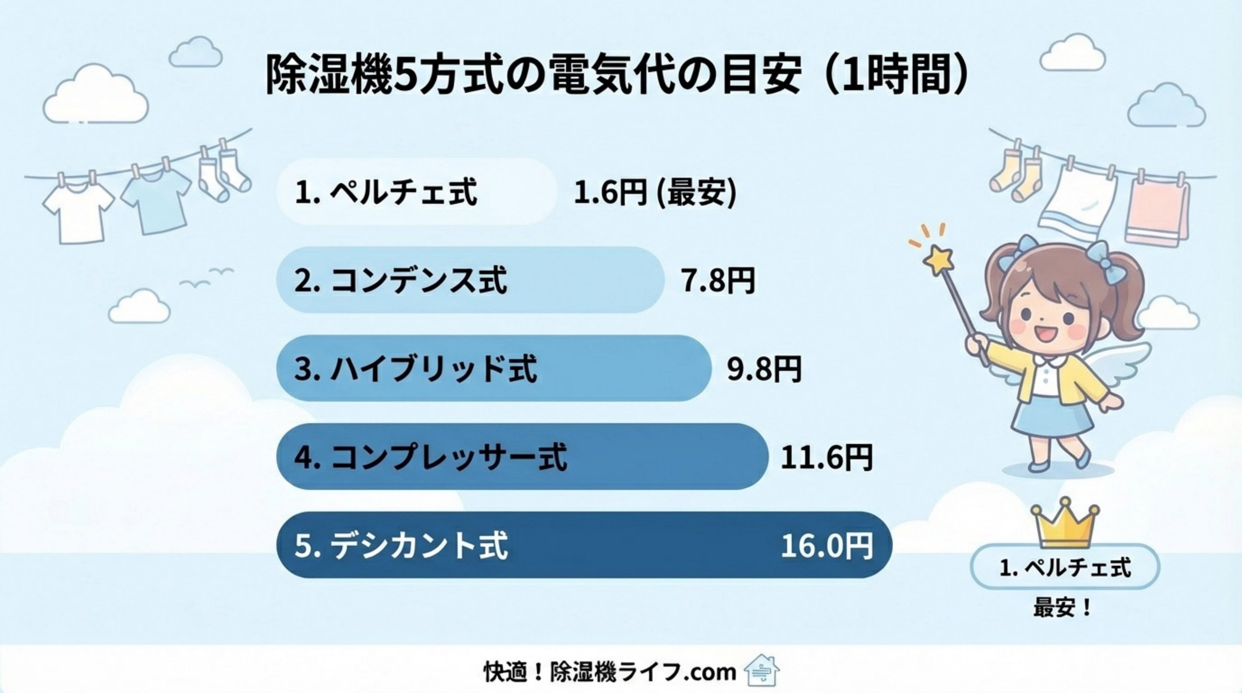 当サイト独自に各除湿方式の「1時間あたりの電気代」を計算し、目安としました。