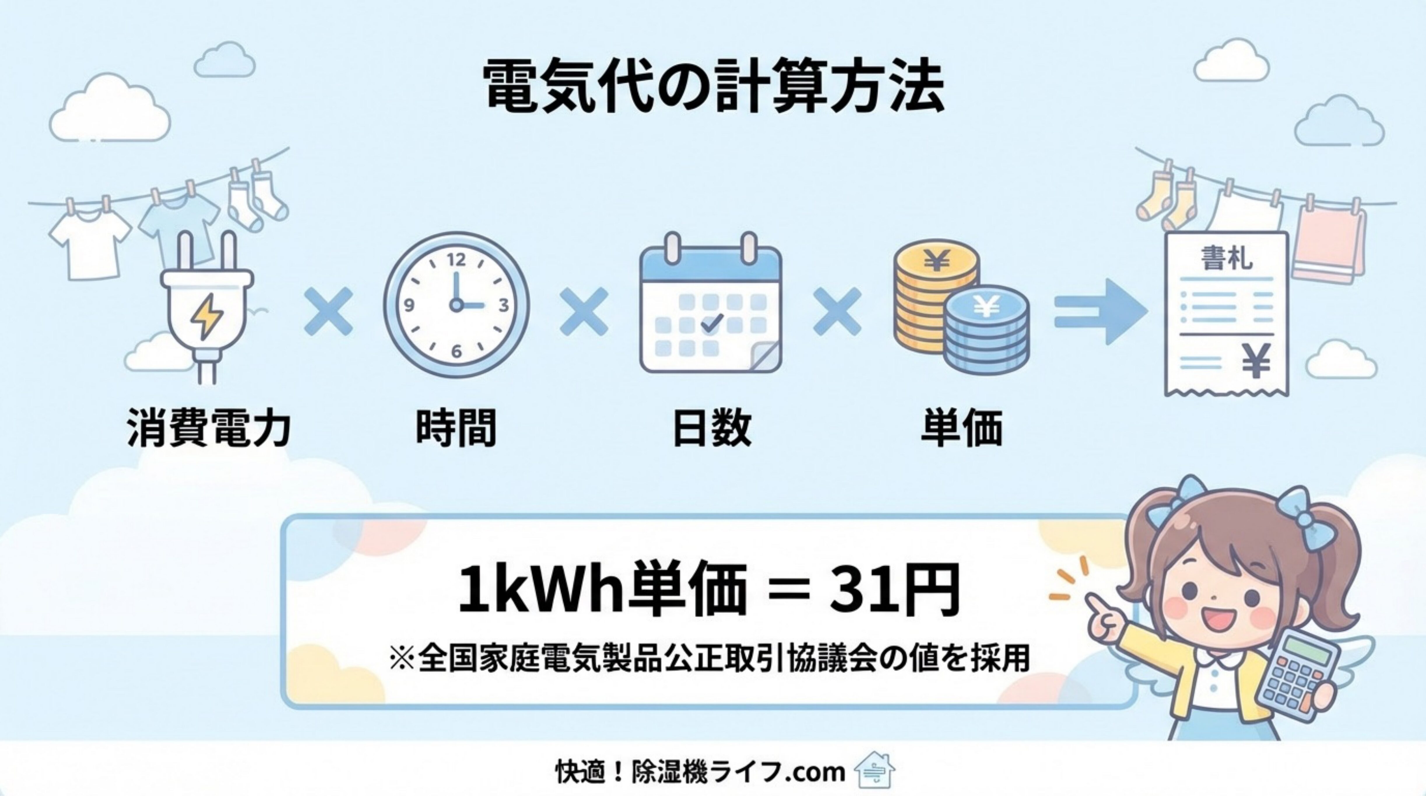 消費電力 × 1日の使用時間(1時間) × 使用日数(1日) × 1kWh単価31円