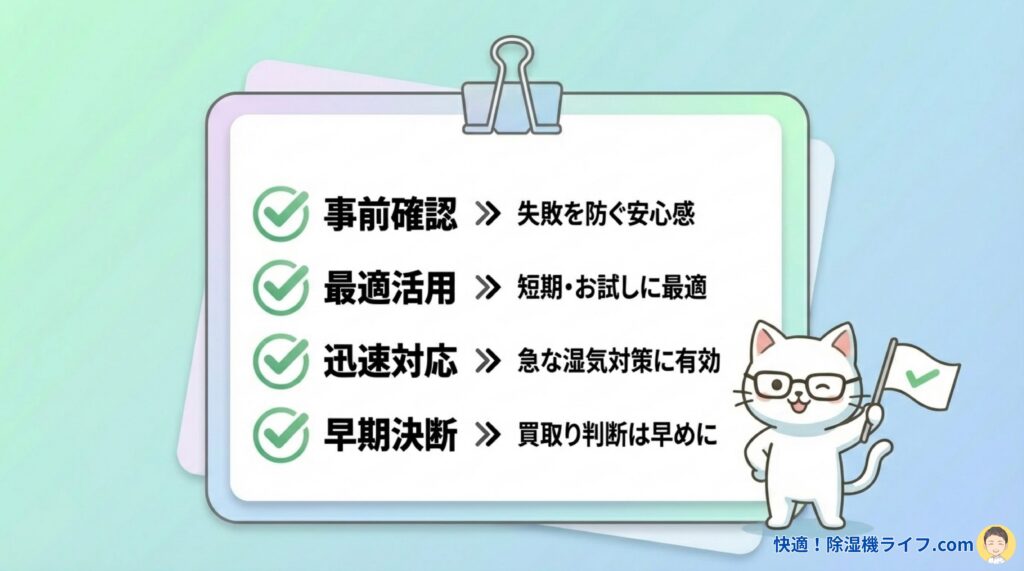 まとめ【2026年最新版】GYMGATEレンタルの評判は?除湿機を安く試す方法と失敗しない選び方