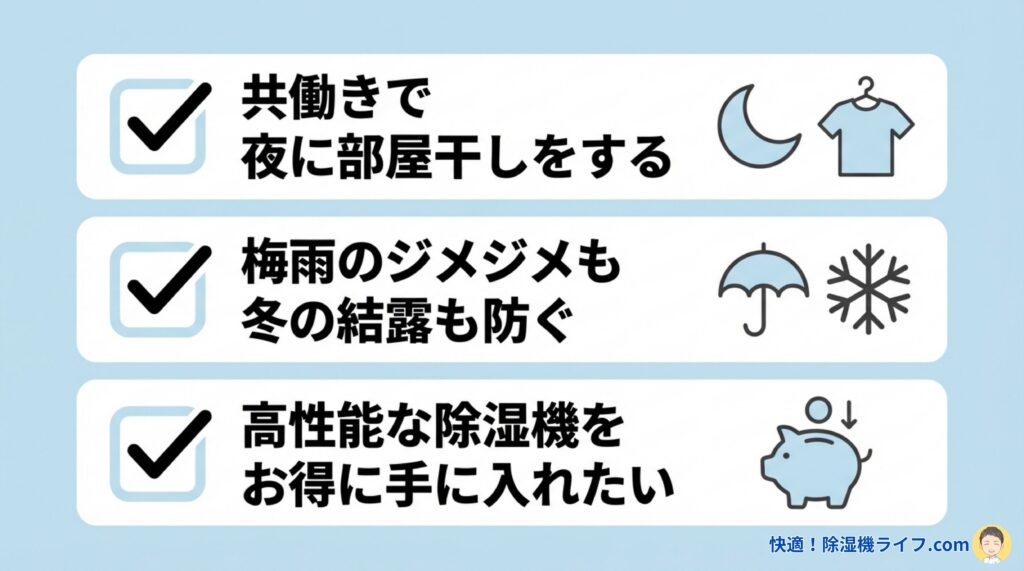 数ある除湿機の中で、CV-SH150は以下のようなライフスタイル・お悩みを持つ方にかなりおすすめです。