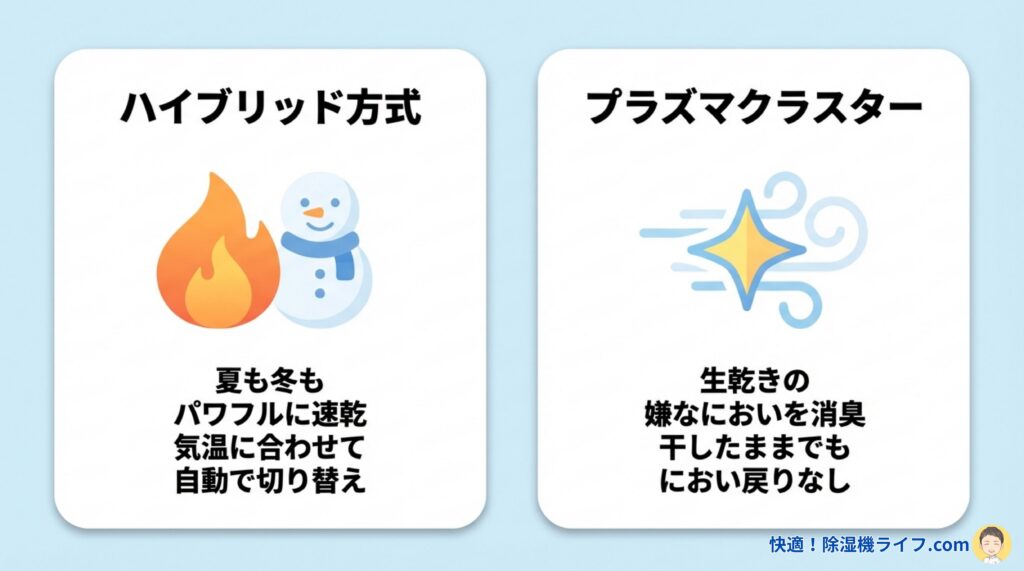 • ハイブリッド方式で、梅雨のジメジメも冬の寒さも関係なく1年中パワフルに乾く