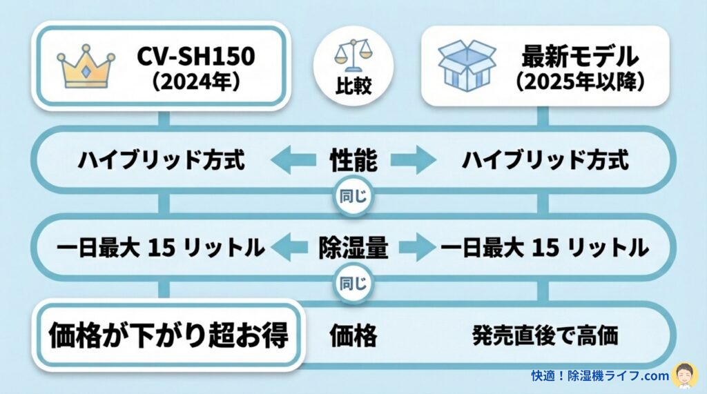「CV-TH150(2025)」と型落ちの「CV-SH150」は、基本的な除湿性能や搭載されている機能が「ほぼ同じ」だから